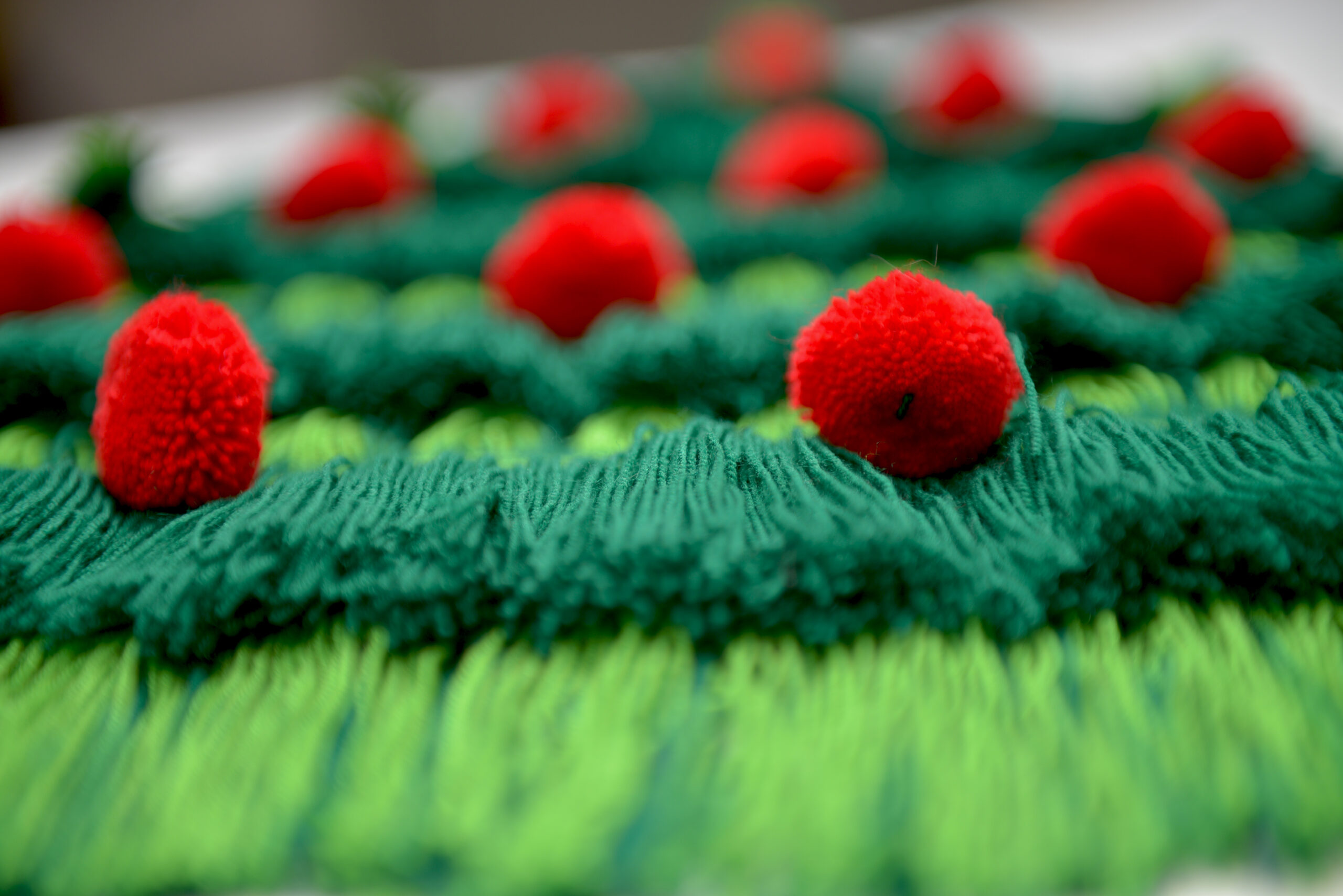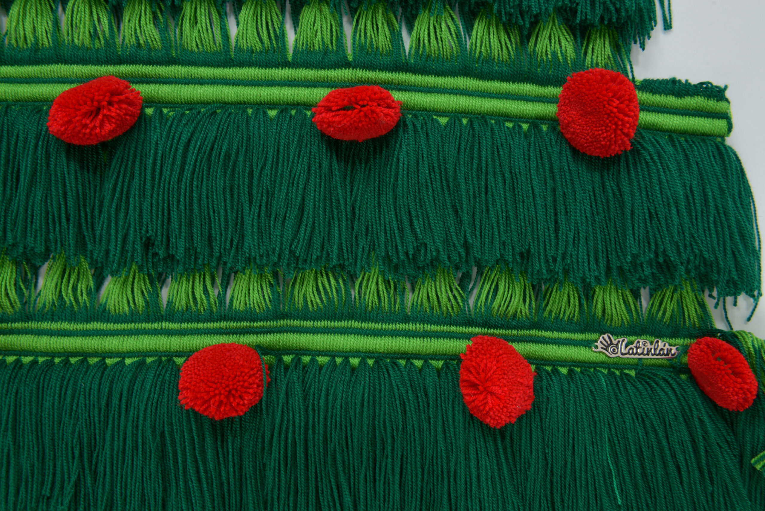 Se teje en telar vertical con hilos de tonalidades verdes nivel por nivel y llevando una cuidadosa cuenta mental de los hilos. Los pompones rojos a manera de bolitas de navidad también son elaboradas a mano.