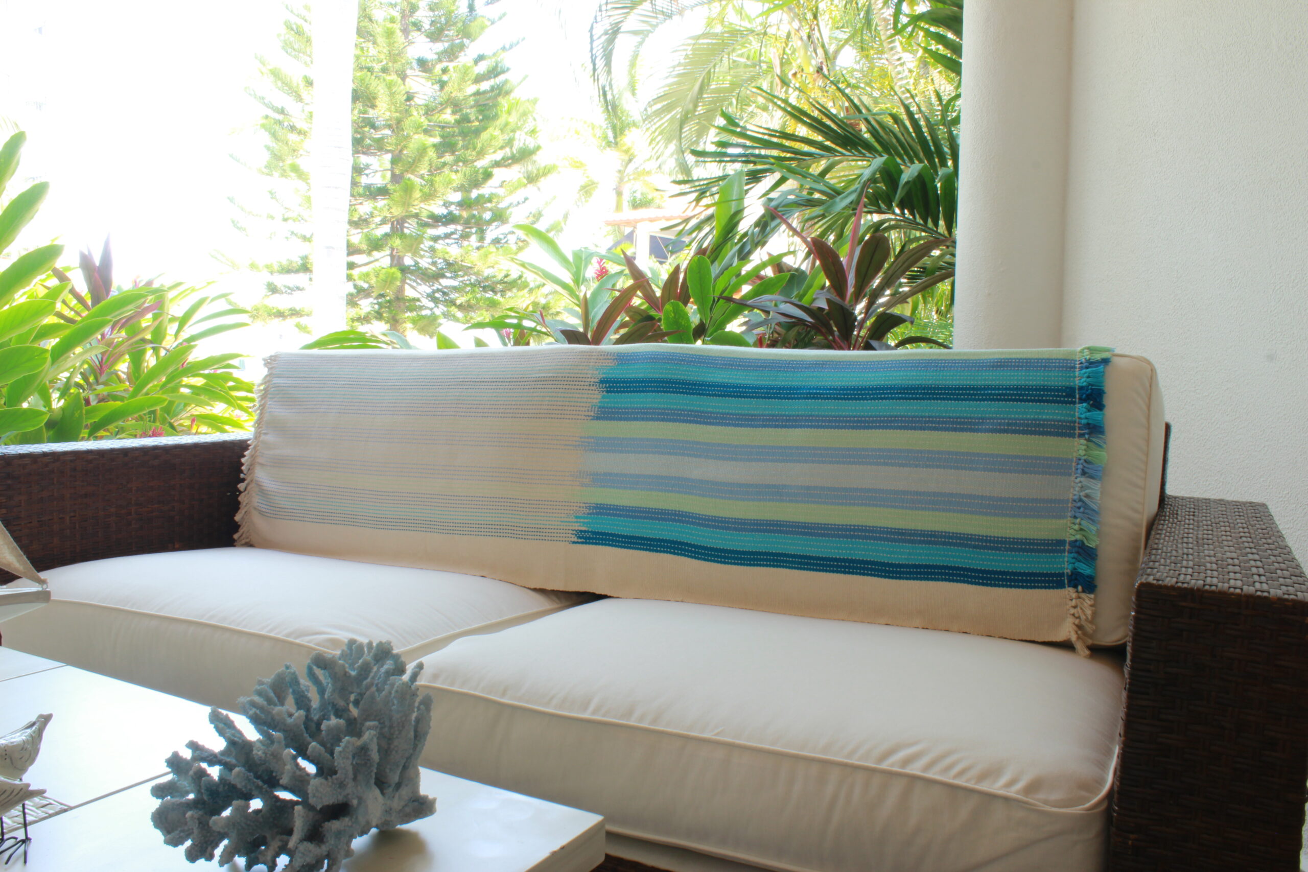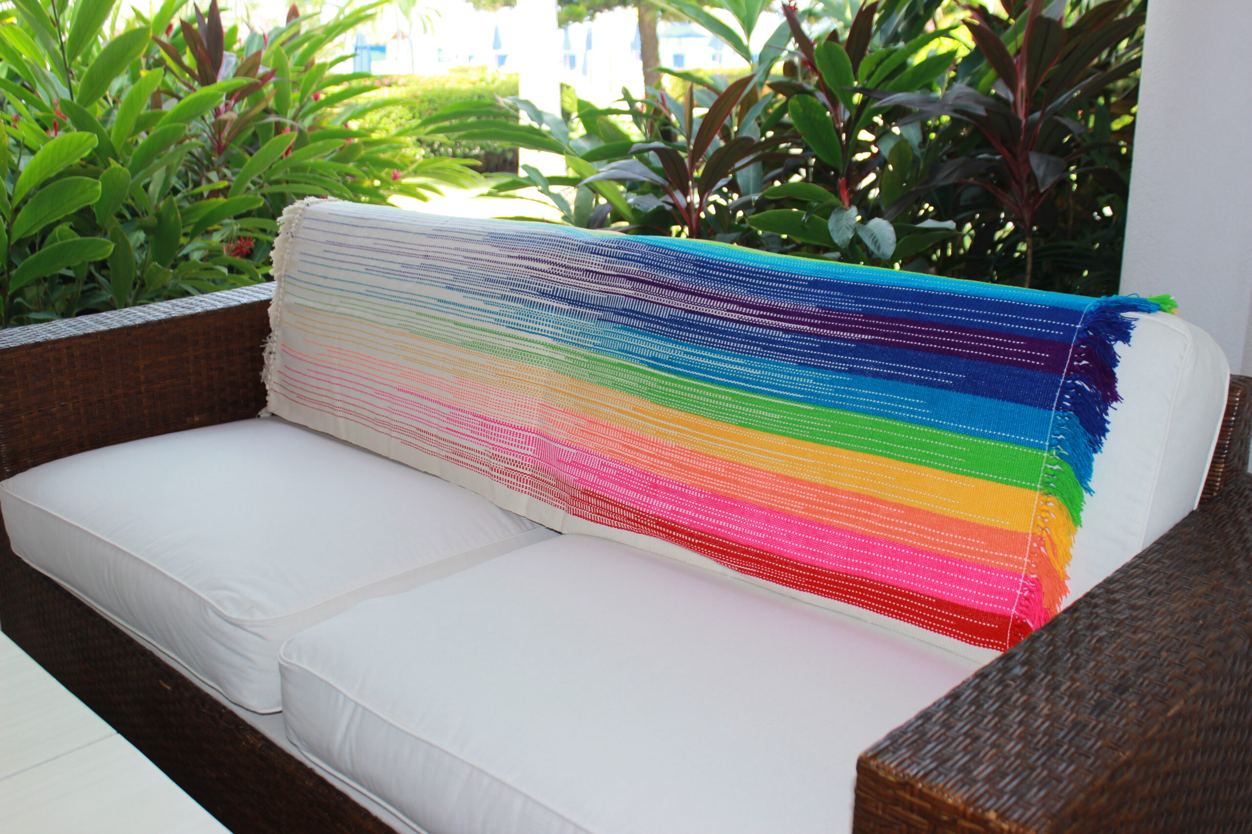 Esta pieza es 100% hecha a mano y con nuestra filosofía ecofemminista y vegana; tejida en telar vertical. Es preciosa para darle el toque de color a cualquier rincón de tu casa; tu cama, tu sofá, tu mecedora o para la playa !