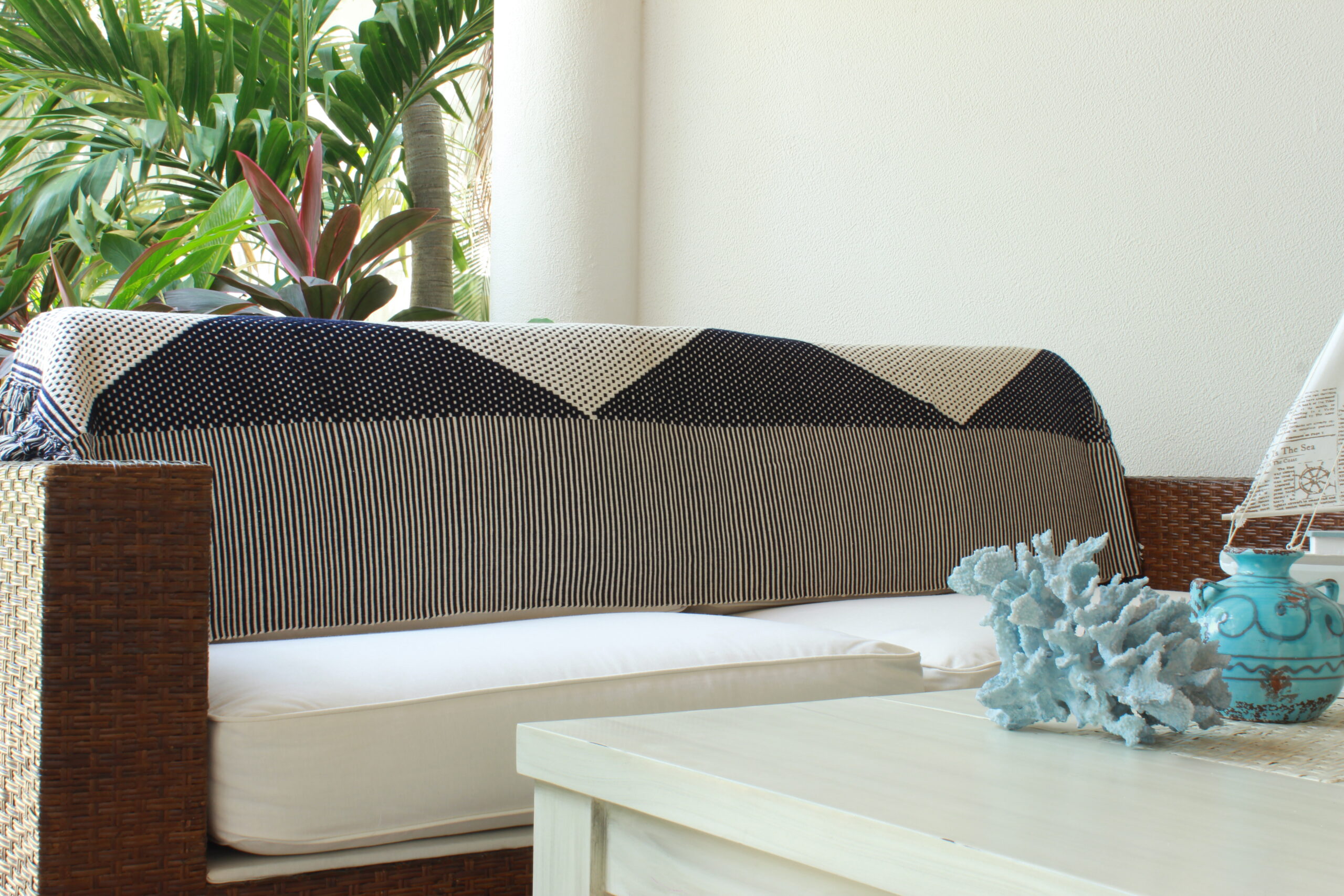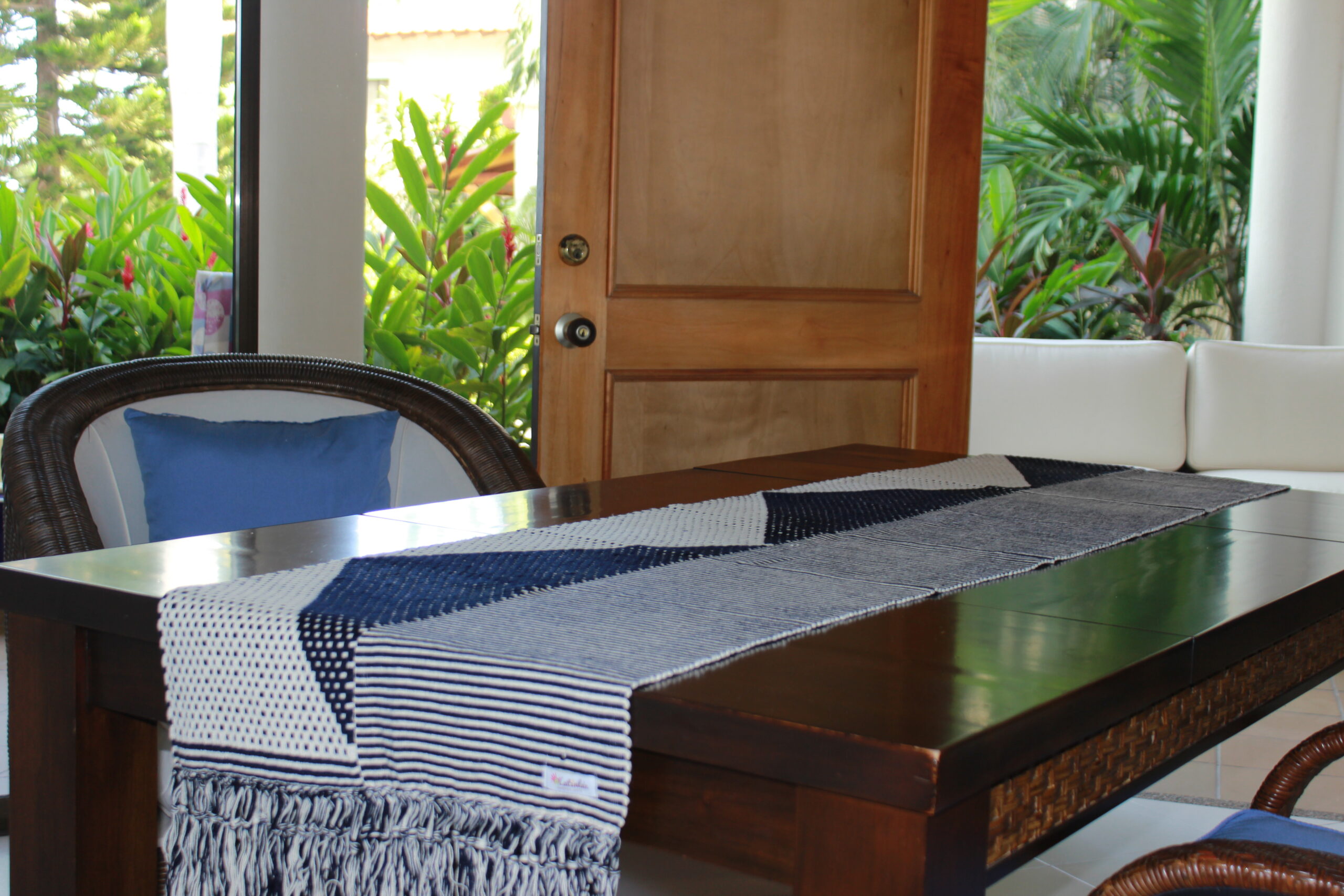 Inspirado en colores marinos, su sobriedad y elegancia es acorde a cualquier uso:  pie de cama, camino de mesa o chal son algunas ideas.  Este producto, con un diseño evocador de la Sierra Nevada de Santa Marta, es elaborado fina y minuciosamente creando dos tipos de labrados que se juntan en una hermosa pieza; por una parte, se teje un mar de delgadas líneas verticales y en la otra, montañas llenas de puntos en contraste de claro-oscuro.  Esta pieza es una auténtica joya diseñada y elaborada por artesanos de San Jacinto, Bolivar.
